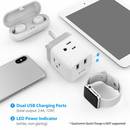 3. Compact size & easy access. Measured only at 2.40” x 1.97” x 1.97” (plug length not included), it can save your precious luggage space and makes a great travel companion during UK trips. With the 3 outlets on each side, it could allow 3 bulky or standard plugs to be used simultaneously. The front 2 USB ports are very easy to reach, and won’t be blocked by other power adapters or cords