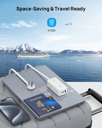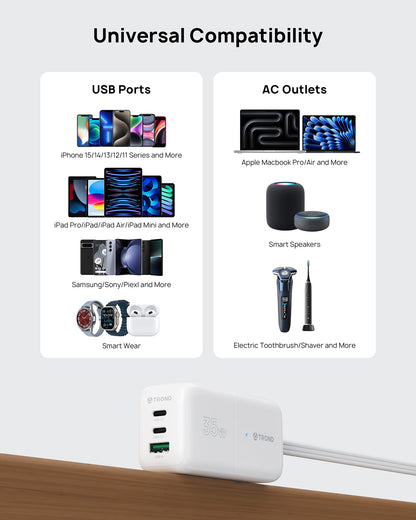 Fast Charging for 3 Devices. With 2 USB-C ports and 1 USB-A port, effortlessly charge your phone, and pad, all at once from a single charger. Connect a single device to charge up to 35W. When multiple devices are charged at the same time, the USB-C1 port can reach a maximum output power of 20W. Overload protection design allows the charger to suspend operation when the output power is greater than 35W.
