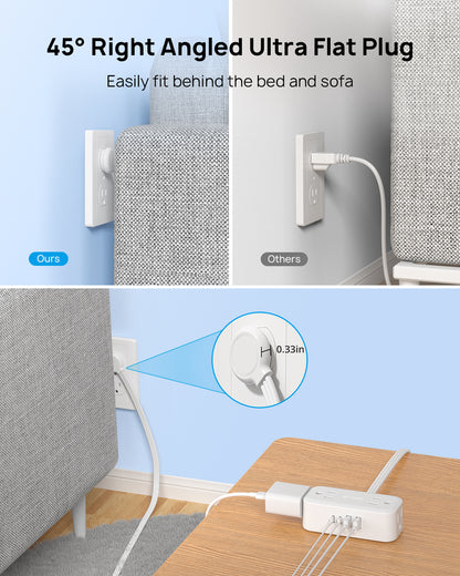 - 【Ultra Thin Flat Plug & 5Ft Extension Cord】With only 0.33 in ultra thin plug, the low-profile flat plug fits easily in tight spaces, and the 45° right angle design prevents bottom plug blocking, 5Ft extension cords only 0.15in thick perfect under the carpet and through door gaps.