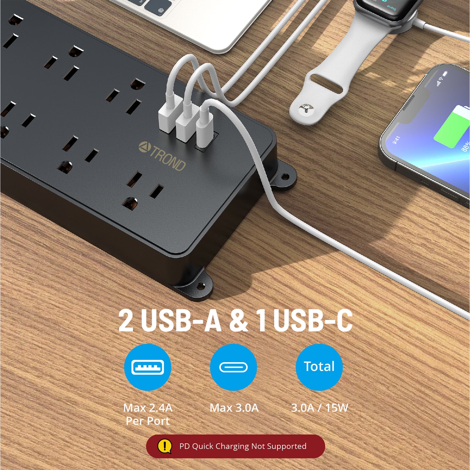 - 【10 in 1 Power Strip with USB-C】This 2 prong to 3 prong outlet adapter has 7 AC outlets and 3 USB charging ports (1 USB C), which can power up 10 devices simultaneously. Max Capacity Up to 1625 Watt (Max 125 Volt, 13 A). Maximum 2.4A output for each USB A port, and Maximum 3A output for USB C port, USB total output 3A/15W. Compatible with iPhone, tablet, laptop, camera, and more. Power Delivery charge technology for USB C is NOT supported.