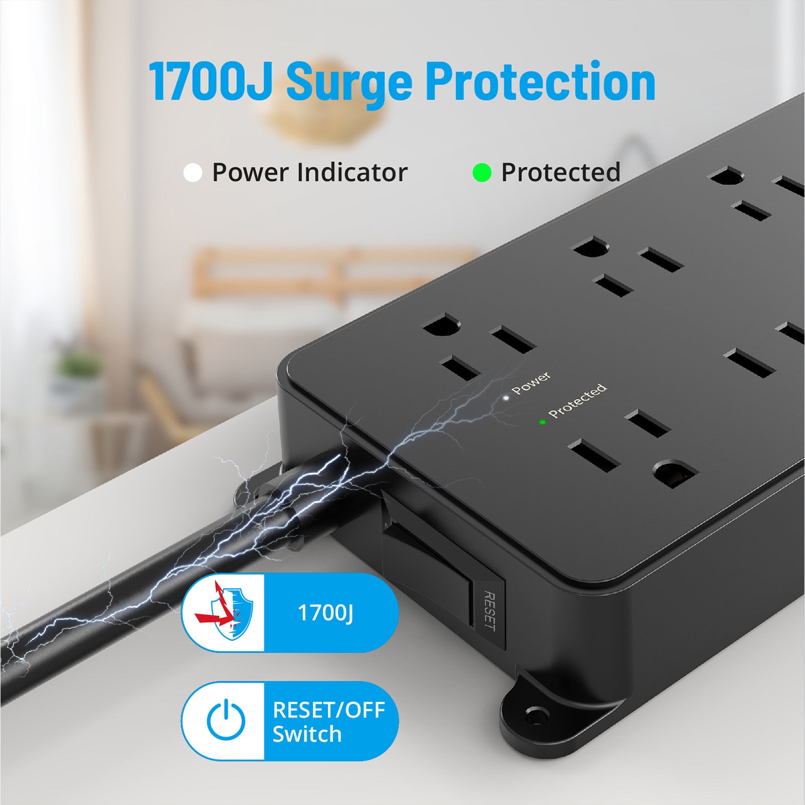 - 【Multiple Protection】This 2 prong surge protector is made of the top-grade UL 94 V-0 flame-retardant PC+ABS material and also provides 1700 Joules surge protection, can protect your computers or home/office electronics from power disturbances such as lightning, surges, and spikes. If the power load exceeds 13A/1625W, the circuit breaker will trip, automatically to keep your device safe.