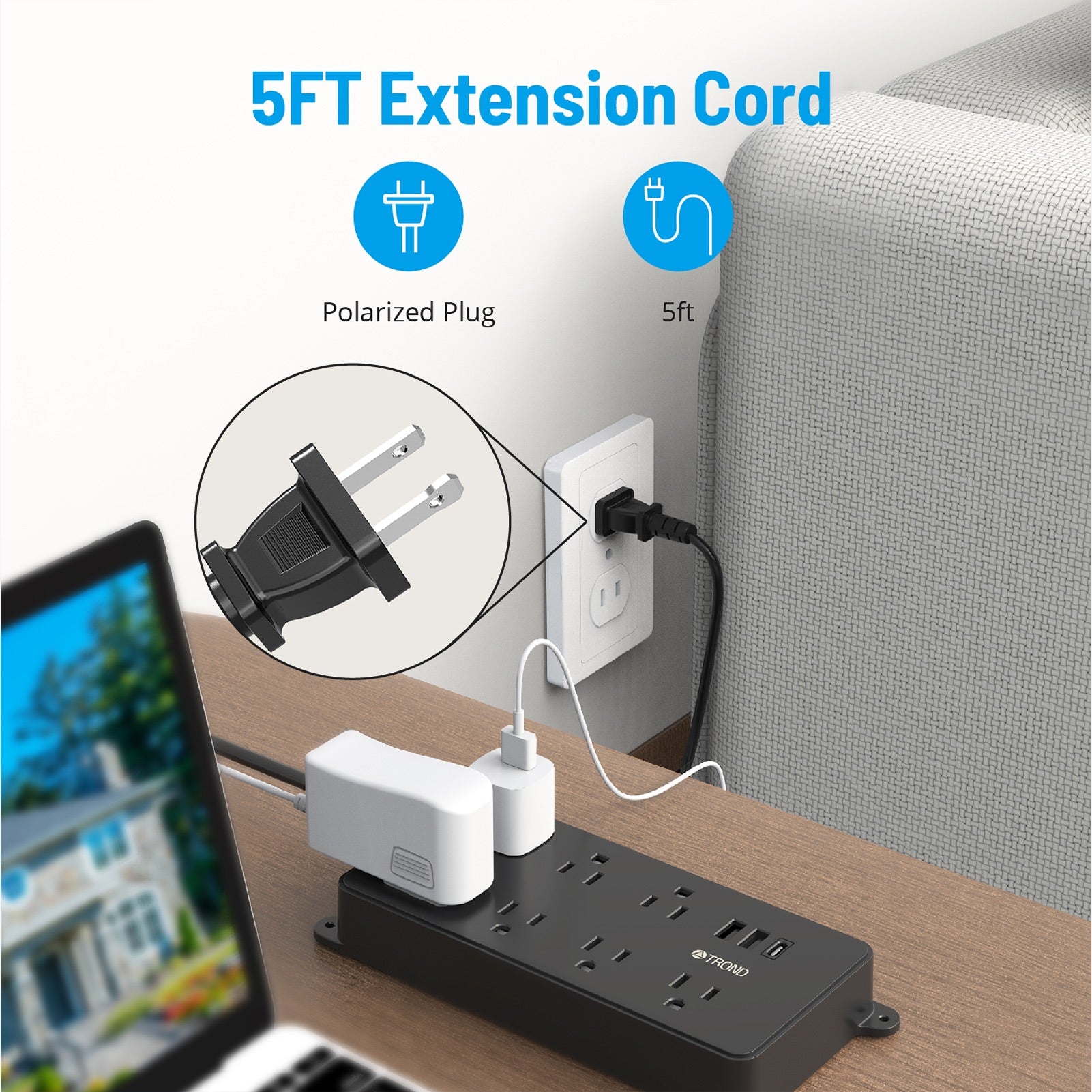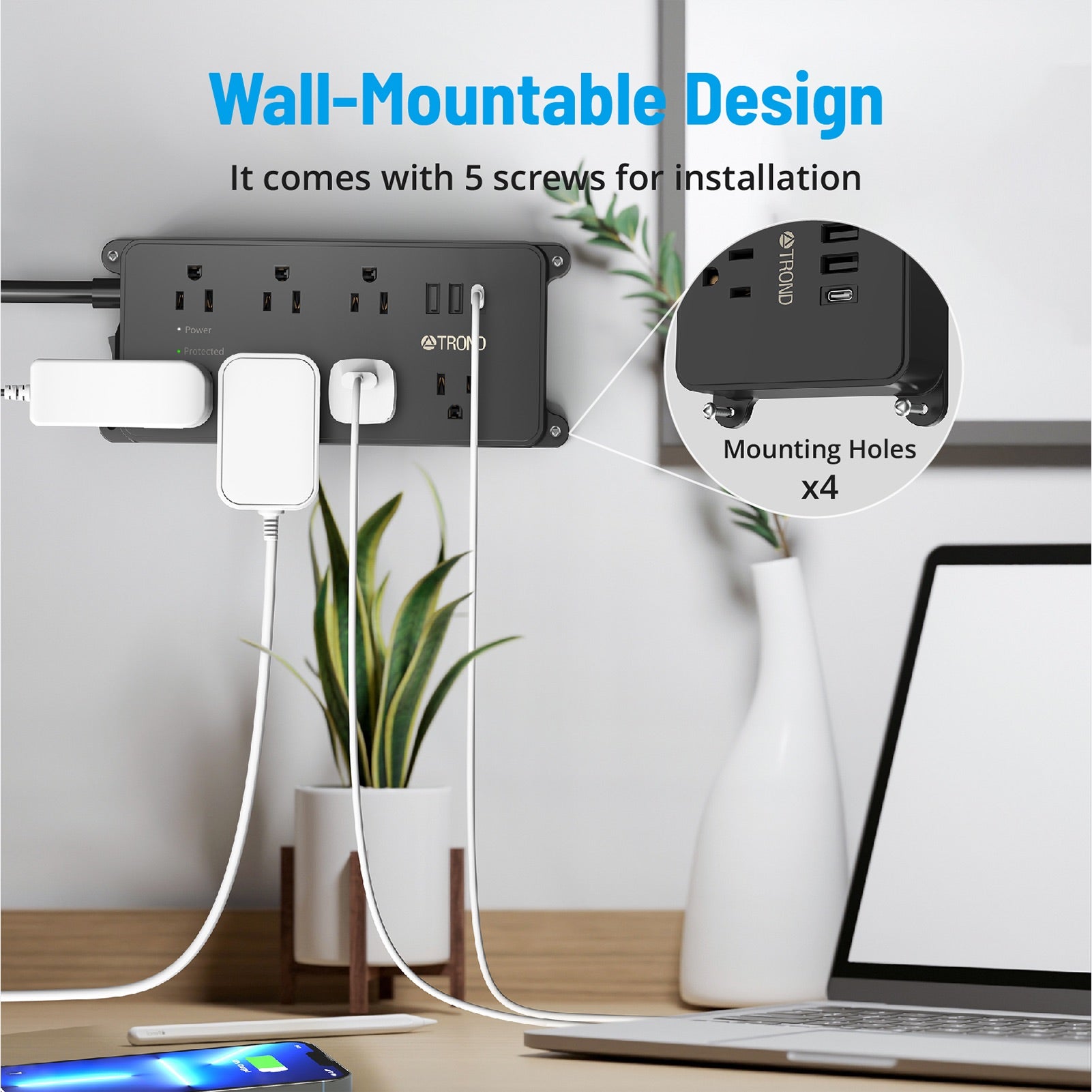 - 【Wall Mountable & 5ft Extension Cord】This mountable power strip has 4 mounting holes and comes with 5 screws, you can easily mount it on the wall or behind a TV/bed, or under a desk/cabinet. The wall-mounted design saves space on your desk. 5 feet power cord with polarized plug is long enough to reach far-flung outlets, made of 16awg pure copper with better current carrying capacity (13A).