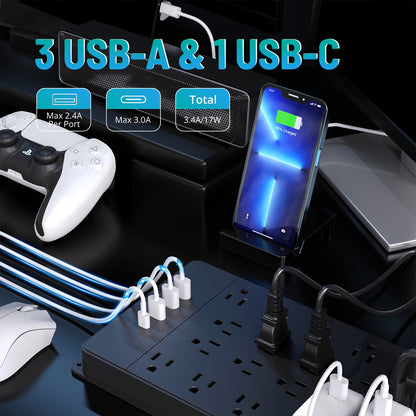【Fast & Smart USB Charge】The large power surge protector is equipped with 3 USB A and 1 USB C charging ports (17W total output), built-in smart charging technology, which can automatically charge your phone, tablet, watch, headphones, game controller, and other stuff quickly up to 5V/3A.