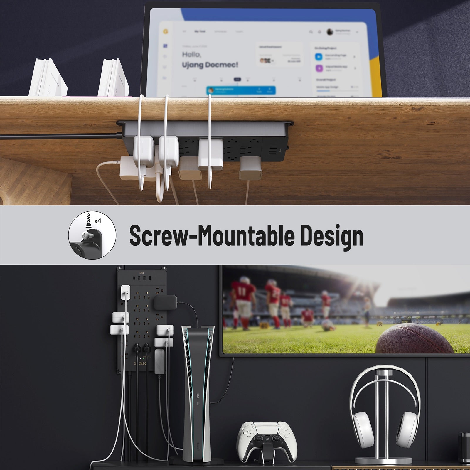 【Mountable and Flat Plug】Our power strip equipped with 4 screw holes in the corners, allows you to securely mount the surge protector box on the wall or under the desk. The 45° angle flat plug design is perfect for hiding behind furniture, bookshelves, and bedside tables in tight spaces.