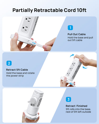 【Semi-retractable Extension Cord for Easy Management】The white extension cord tower features a 10ft flat power cord, allowing you to adjust the cable length as needed. Hold the base and rotate the tower's body to roll a 5ft cable into the base, and the rest of the will left outside. Note: Please unplug all adapters in the tower when retracting the cord to avoid cords tangled