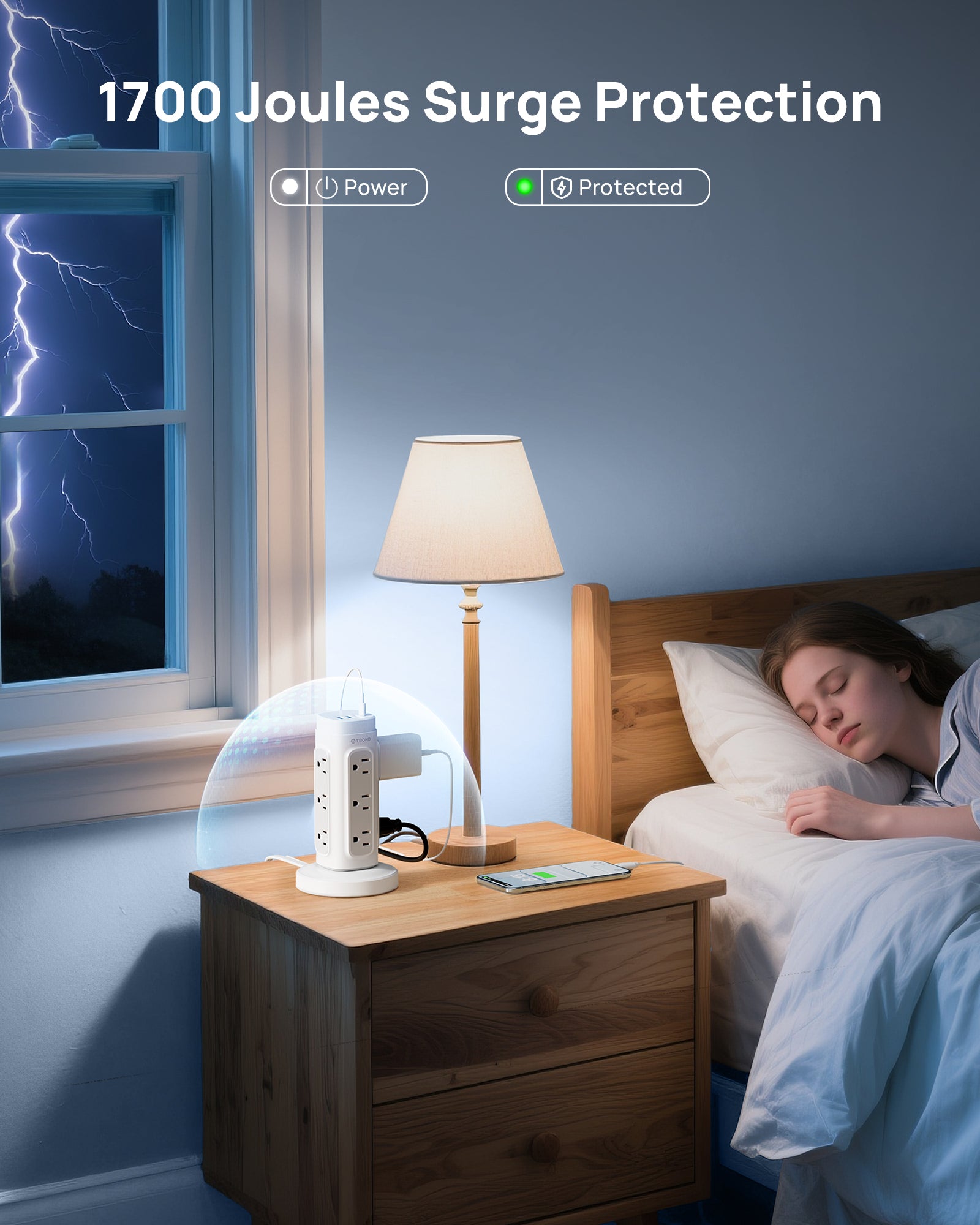 【Safety Assurance Surge Protector Power Strip】Made of the top-grade UL94 V-0 flame-retardant PC & ABS, and featuring 1700 Joules surge protection, overload protection, short-circuit protection, over-current protection, the power strip tower provides reliable protection for your computers and home/office/college dorm electronics