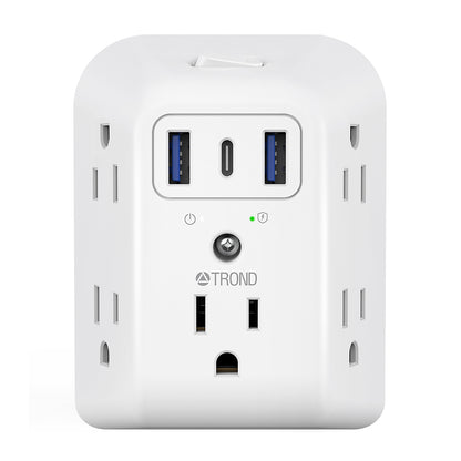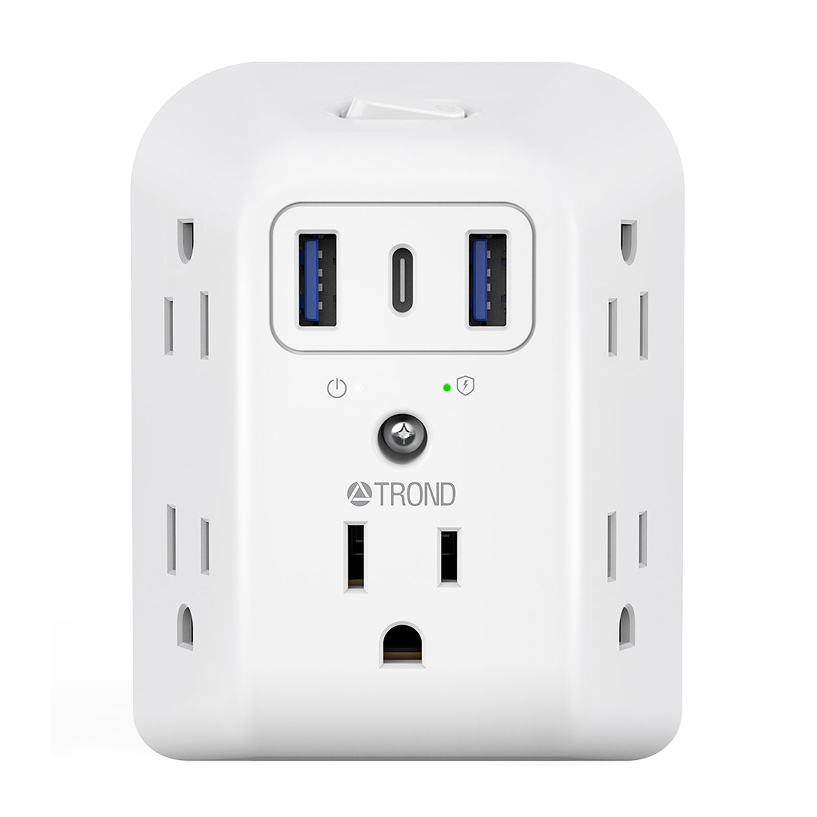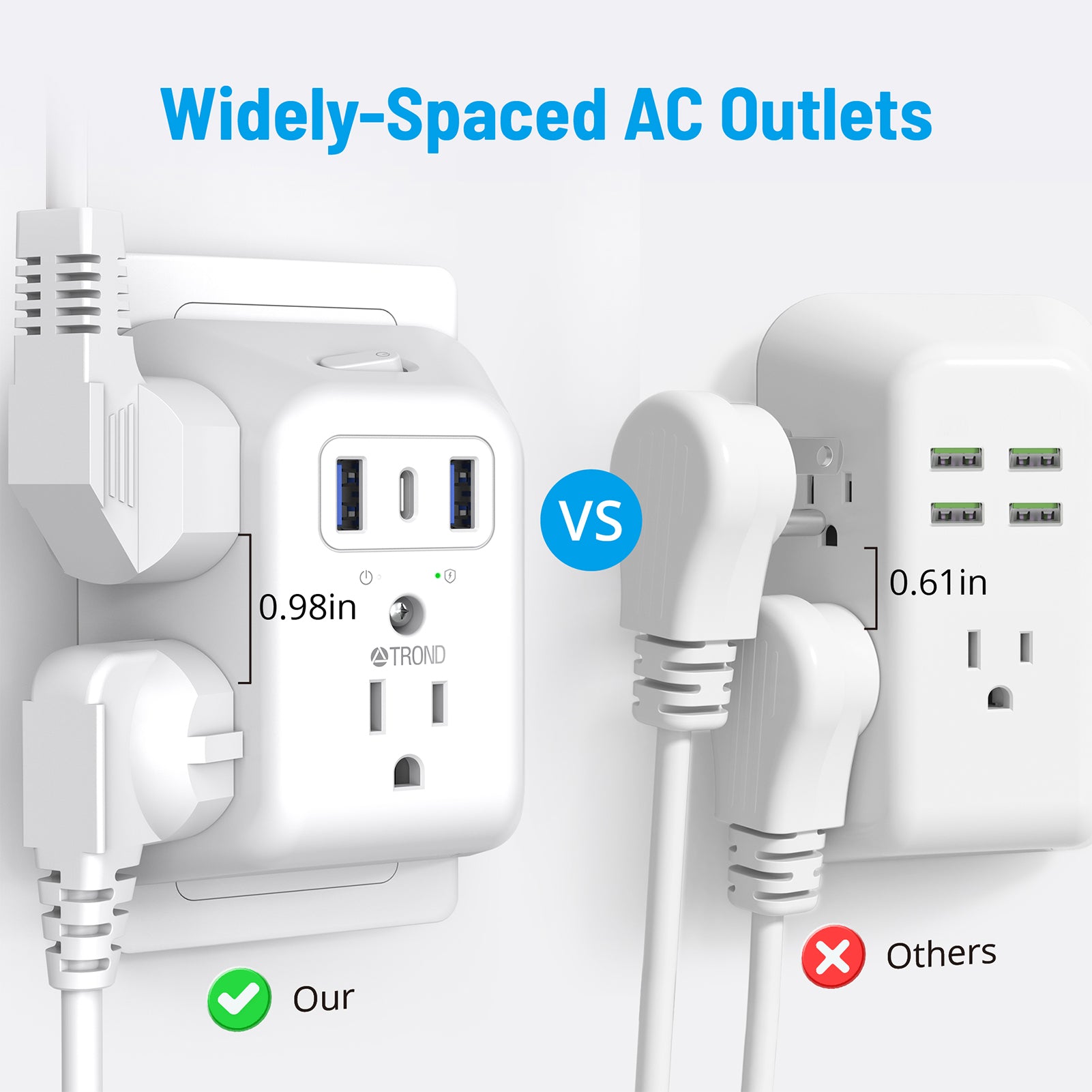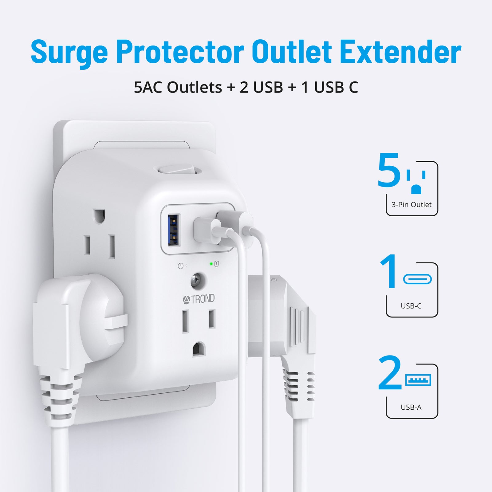- 【Multi Plug Outlet Extender with USB】:Best for duplex outlet or other wall outlet, just plug in to use. You get wide space 5 AC outlets (1875W) with 2 USB charger ports and 1 USB C port. The surge protector power strip come with a screw port to hold it tightly to the plug which makes you feel safe. This wall plug design with ON/OFF the power switch, which brings more convenience for your daily use.