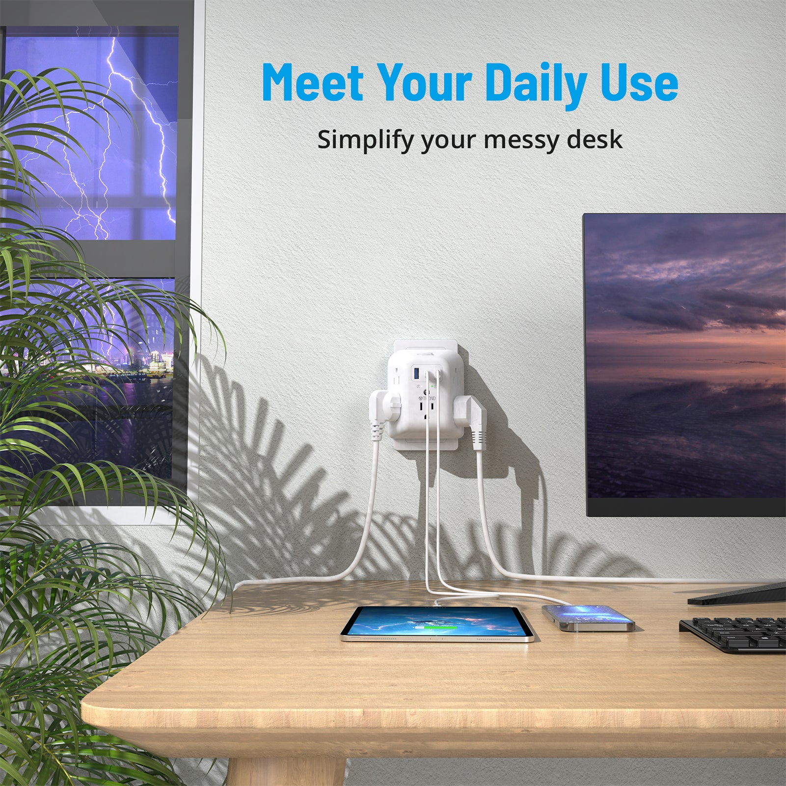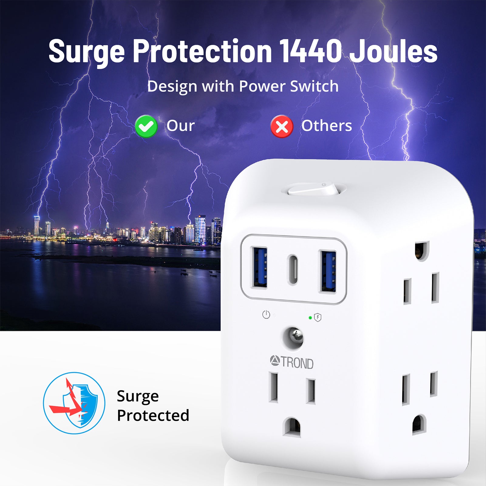 - 【 Reliable Surge Protector Outlet 】:3 complementary Surge Protection Circuits, TVS(transient voltage suppressor) MOV(metal oxide varistor) GDT(gas discharge tube), with response speed less than 1Ns, and made of the top-grade ul94 v-0 flame-retardant material. With 1440 Joules surge protection, it safeguards your tv, computers, phones & office equipment from potentially damaging power disturbances, creating peace of mind.