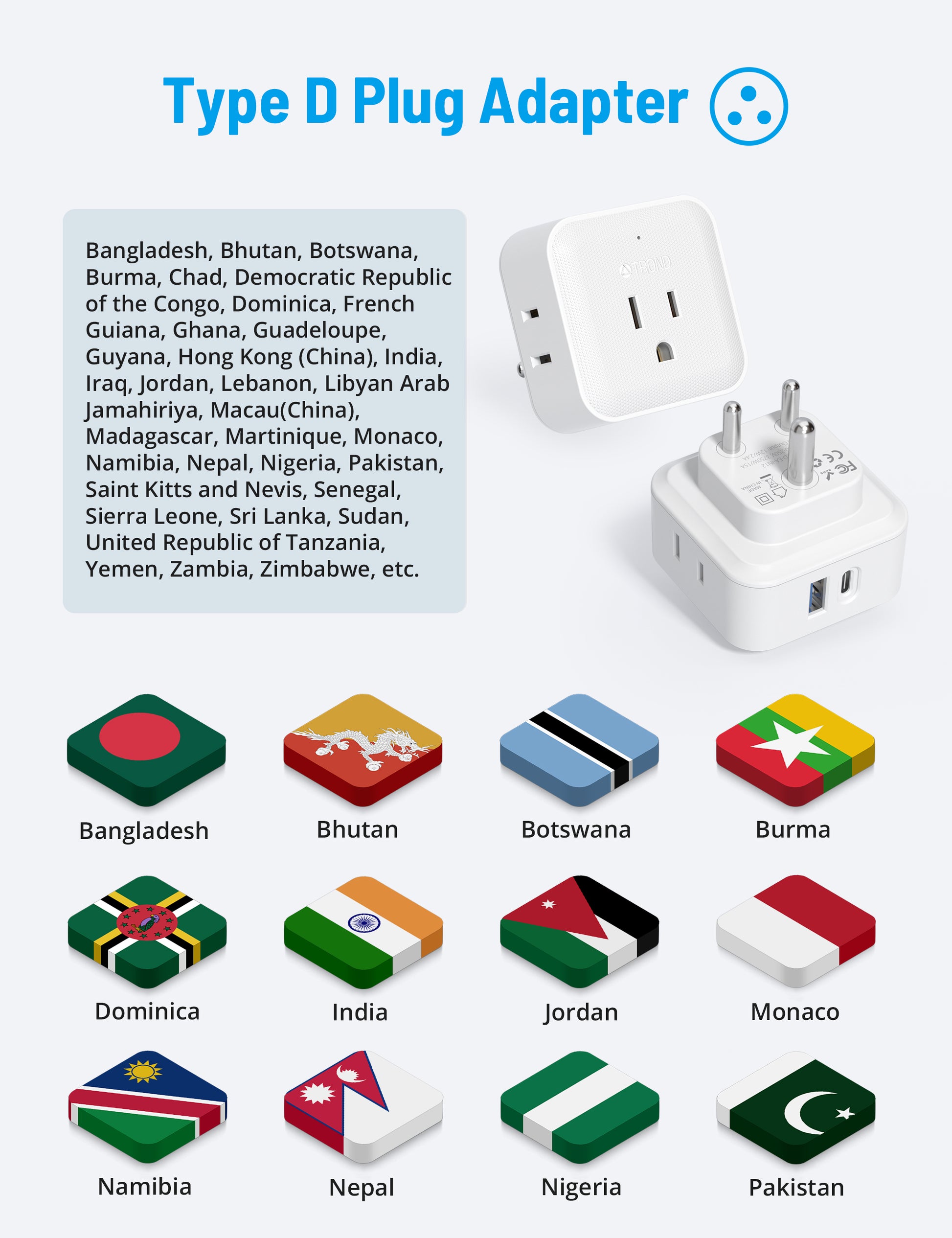 1. India to US plug adapter. This India travel adapter is ideal for your trip to Bangladesh, Bhutan, Botswana, Burma, Chad, Dominica, Ghana, Guadeloupe, Guyana, Hong Kong , India, Iraq, Jordan, Lebanon, Macau, Madagascar, Martinique, Monaco, Namibia, Nepal, Nigeria, Pakistan, Senegal, Sri Lanka, Sudan, Yemen, Zambia, Zimbabwe, etc.